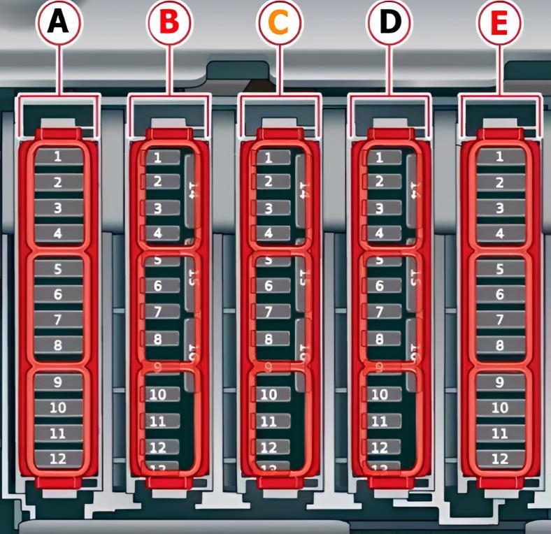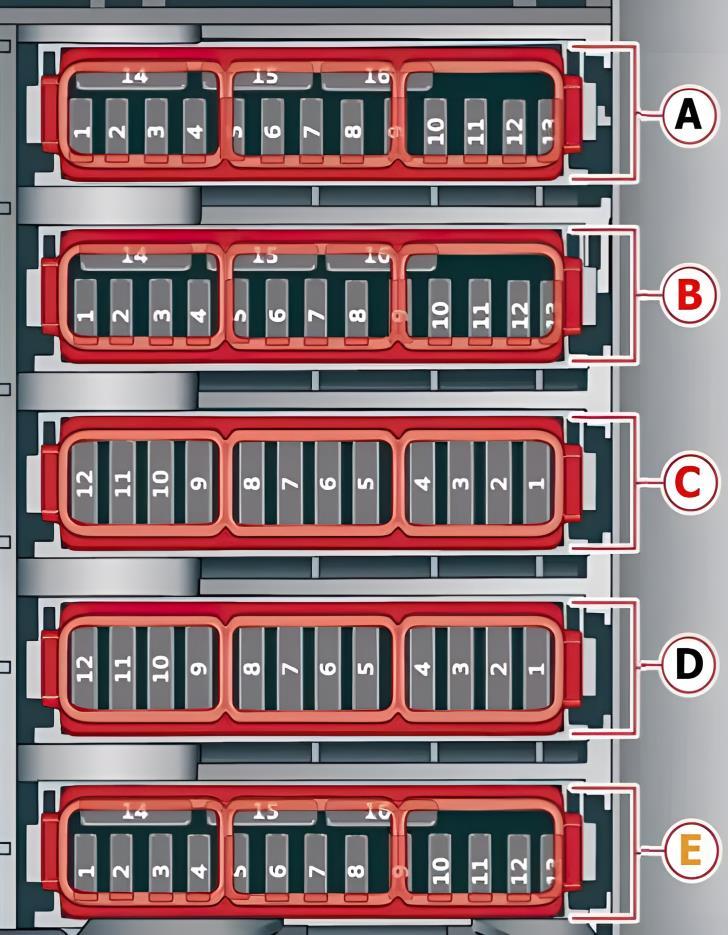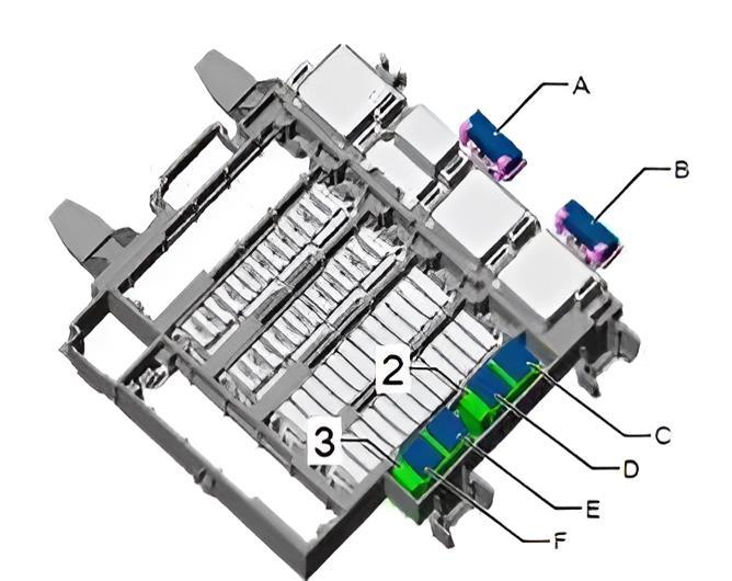 E1. | 2018-2019: Sitzbelüftung, Sitzheizung, Rückspiegel, Klimatisierungssystem, Bedienelemente für das hintere Klimatisierungssystem oder von 2020 bis 2024: Sitzbelüftung, Sitzelektronik, Rückspiegel, Bedienfeld für das hintere Klimatisierungssystem, Diagnosestecker, Antenne für Verkehrsinformationen (TMC)