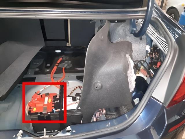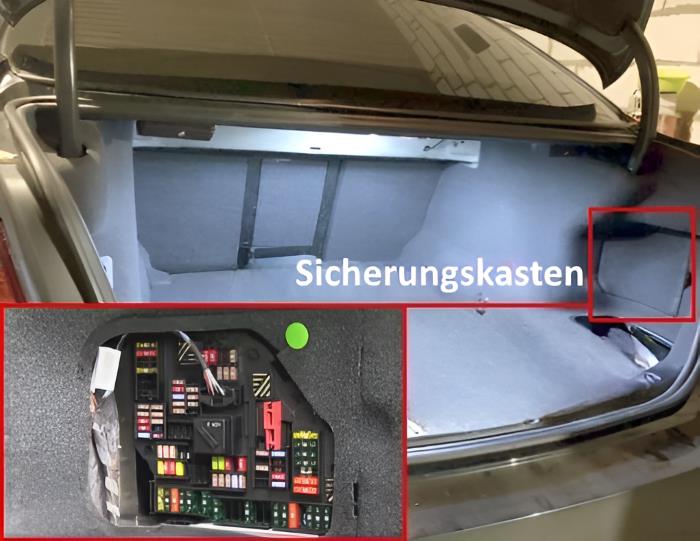 Die Batterie befindet sich unter der Bodenverkleidung des Kofferraums. An ihrem Pluspol befindet sich eine Platte mit Hochstromsicherungen.