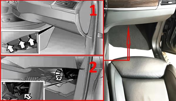 Der Sicherungskasten befindet sich im Beifahrerfußraum. Um an sie heranzukommen, die drei Befestigungsschrauben (1) abschrauben und die Verkleidung absenken. Dann (2) die Schraube 1 abschrauben und den Gerätehalter 2 absenken.