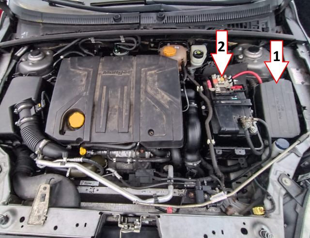 Der Hauptsicherungskasten (1) befindet sich hinter einer Schutzabdeckung in der Nähe der Batterie. Außerdem befinden sich an der Plusklemme der Batterie Hochstromsicherungen (2).