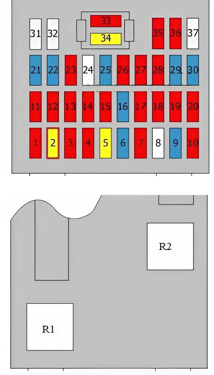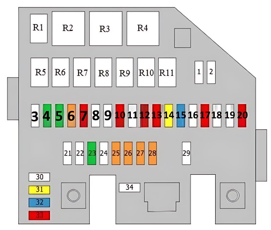 22. | Sicherungskasten und Relais im Fahrgastraum, Relais R8 und Sicherungen 2-7, 25, 33, 34 | 50A