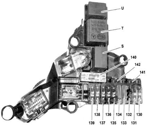 37. Multifunktionssteuergerät 1 - an der Sicherungs-/Relaisbox im Motorraum 1 angebracht - Funktionen: Klimakompressor, Klimadruckregelung, Bremsflüssigkeitsstand, Kühlmittelstand, Scheinwerfer, Warnblinkanlage, Scheibenwaschdüsenheizung, Scheinwerferwaschanlage, Blinker, Innenbeleuchtung, Raumtemperatur, Scheibenwaschanlage, Scheibenwischer;