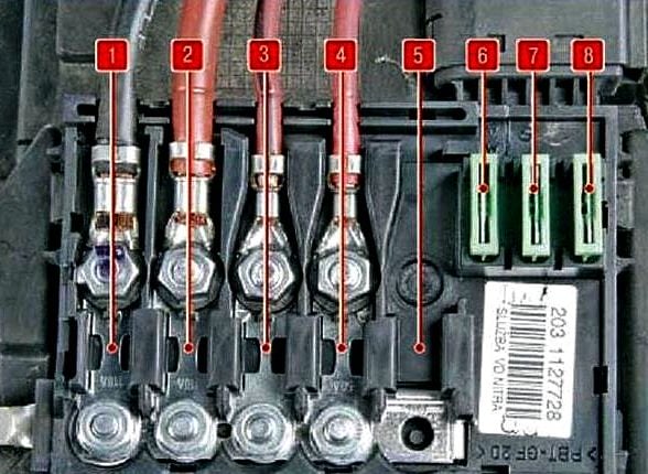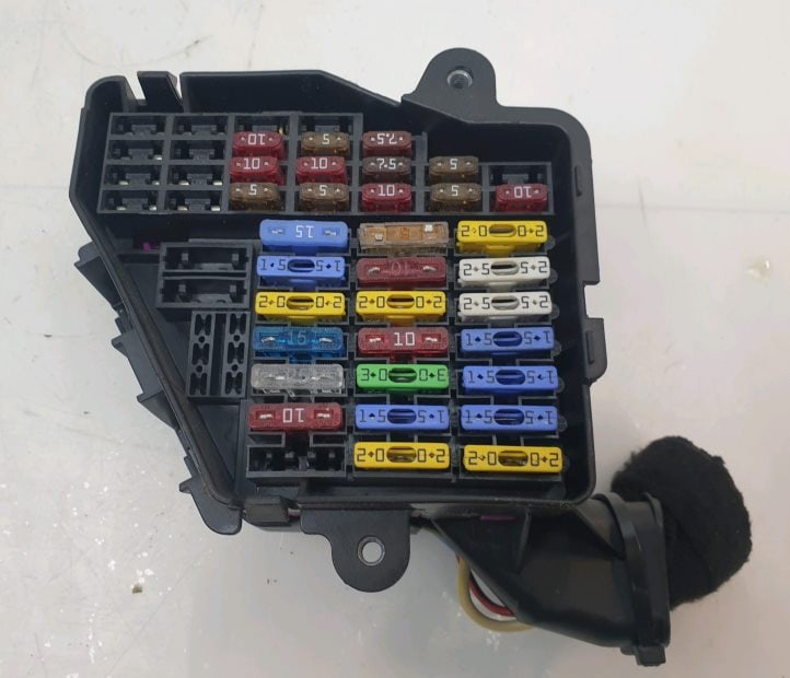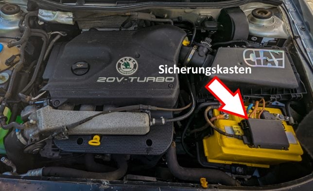 Der hier befindliche Sicherungskasten besteht hauptsächlich aus Hochstromsicherungen. Für den Zugang muss die Batterieabdeckung entfernt werden.