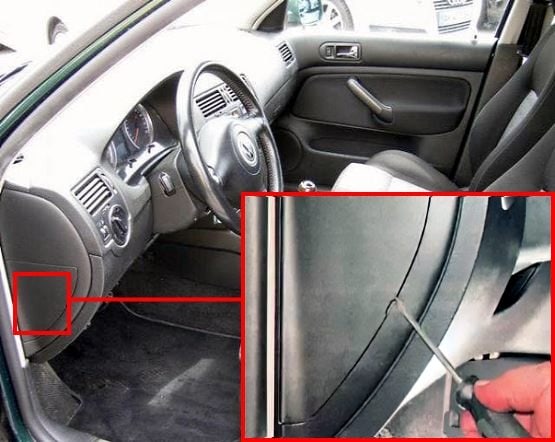 Er befindet sich am Ende des Armaturenbretts auf der Fahrerseite hinter einer Kunststoffabdeckung.
