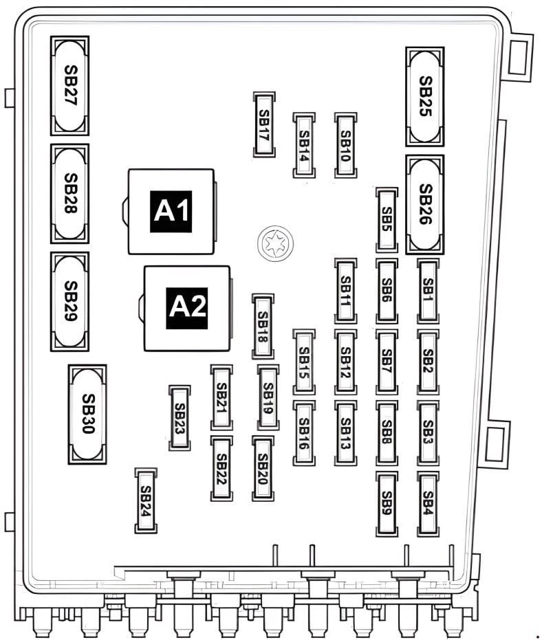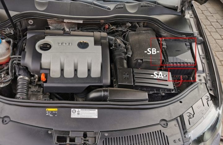 Unter der Motorhaube befinden sich 2 Blöcke: der Hauptsicherungsblock -SA- und der Hauptverteilerblock -SB-. Einige Relaismodule befinden sich auch unter dem Hauptblock.
