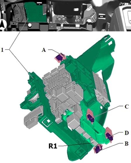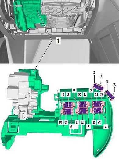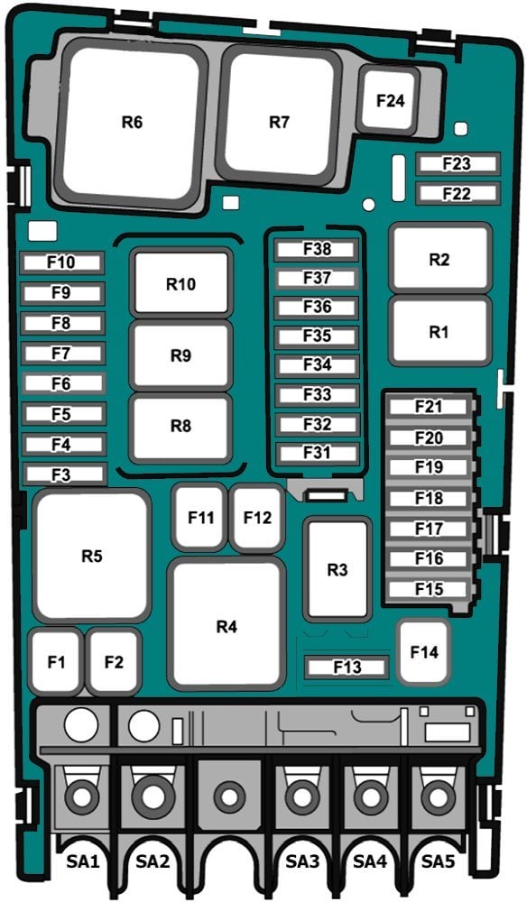 SA1. | Stromversorgung der Sicherungen Nr. 1, 2, 5, 14, 22, 32, 42, 42, 46, 47, 49, 51, 53 im Block des Fahrgastraums | 125A