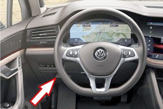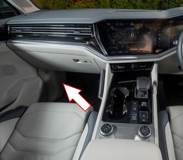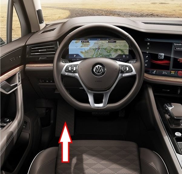 Bei Modellen mit Rechtslenkung befindet er sich im Fußraum auf der Beifahrerseite.
