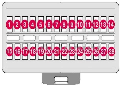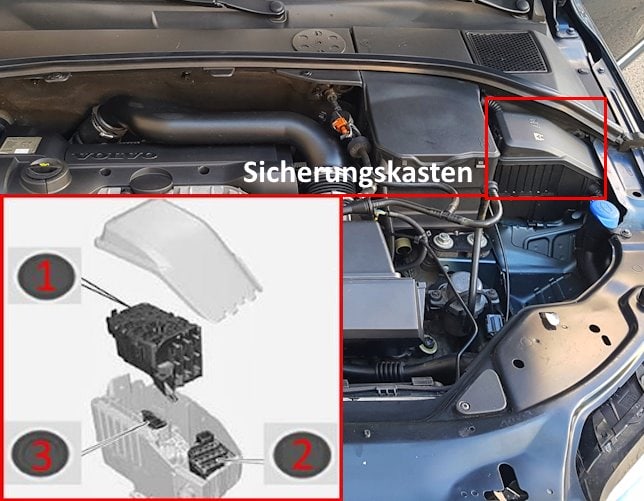 Der Sicherungskasten befindet sich hinter der Schutzabdeckung auf der linken Seite. Sie besteht aus drei Teilen.