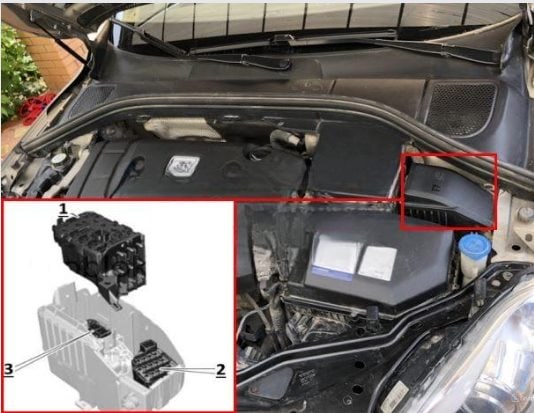 Der Sicherungskasten unter der Motorhaube befindet sich hinter der Schutzabdeckung neben dem Waschmittelbehälter. Er besteht aus drei Teilen.